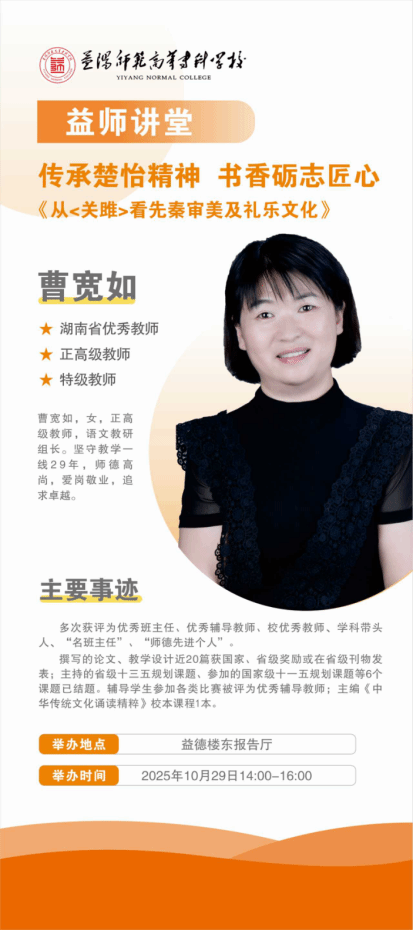 为深入传承与弘扬“爱国、求知、创业、兴工”的楚怡精神,推动“楚怡读书行动”走深走实,营造书香砺志、匠心育人的校园文化氛围,10月29日下午,由我校图书信息中心精心策划的“益师讲堂”系列讲座在益德楼东报告厅成功开讲。本次活动特邀湖南省优秀教师、正高级教师、特级教师曹宽如女士,为师生带来题为《从<关雎>看先秦审美及礼乐文化》的精彩讲座。现场座无虚席,气氛热烈。