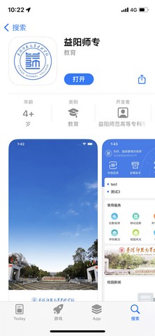 2.在应用商店(APP Store)内单击右下角的“搜索”按钮,在搜索框中输入“益阳师专”,然后【获取安装】即可。